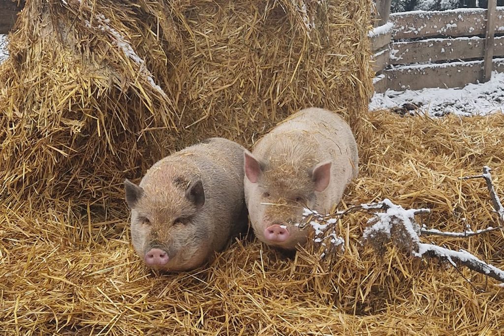 Prasátka bydlí v Domově dvě a jedná se o sourozence Julku a Romíka, jsou to čuníci zachránění z malochovu, kdy majitel zemřel a jeho rodina čuníky rozdávala každému, kdo se přihlásil, Péče o čuníčky není nijak zvlášť náročná, užívají si dostatek spánku, zelenou pastvu, sluníčko ale také zbytky z kuchyně, které pravidelně vyzvedávám. Nutností je 2x do roka podat odčervení a očkování, to vše zajištuje Klub miniprasátek chovaných v domácnosti, který nás navštěvuje přímo v Domově. Romík též potřebuje jednou za čas zkrátit zuby (kly), oba potřebují ošetřit paznehty, oči i uši.